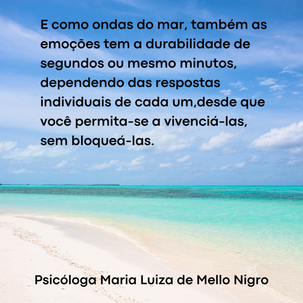 A maioria das pessoas acredita que determinadas emoções como por exemplo, alegria, angustia, raiva, ansiedade, tristeza, medo, surpresa, duram infinitamente. E dependendo do impacto que essas emoções provocam no momento, devem ser bloqueadas assim que surgirem ou que é necessário na maioria das vezes, utilizar alguma técnica para diminuir a intensidade, a fim de que não venham sofrer. Outros sentem-se pressionados a intensificar a emoção ou minimizar, sempre que a percebem. Sem compreender que a emoção é sim, temporária, ela é finita. E para perceber melhor isso, existe uma técnica que consiste em apenas distanciar-se e concentrar-se completamente no presente, mantendo a atenção plena, no “aqui e agora”. E perceber a emoção, como uma onda do mar. Com início, meio e fim, onde a onda atinge a mais alta intensidade e após, recua paulatinamente, diminuindo de intensidade. Não necessita interromper a emoção, mas apenas perceber o grau de intensidade e o quão acentuada ela se mostra para você, como também, quanto tempo leva para diminuir. Caso queira, poderá parar por alguns instantes no dia a dia e perceber com mais atenção, como andam suas emoções. Inclusive se desejar, poderá anotar o grau de intensidade vivenciado por você, referente as suas emoções. Você perceberá que como ondas do mar, também as emoções têm a durabilidade de segundos ou mesmo minutos. Entretanto, não procure retirá-las se perceber que são incomodas ou mesmo prorrogar indefinidamente, se são agradáveis. Mas apenas permita-se a vivenciar e ser transportado pela “onda”, pela emoção.